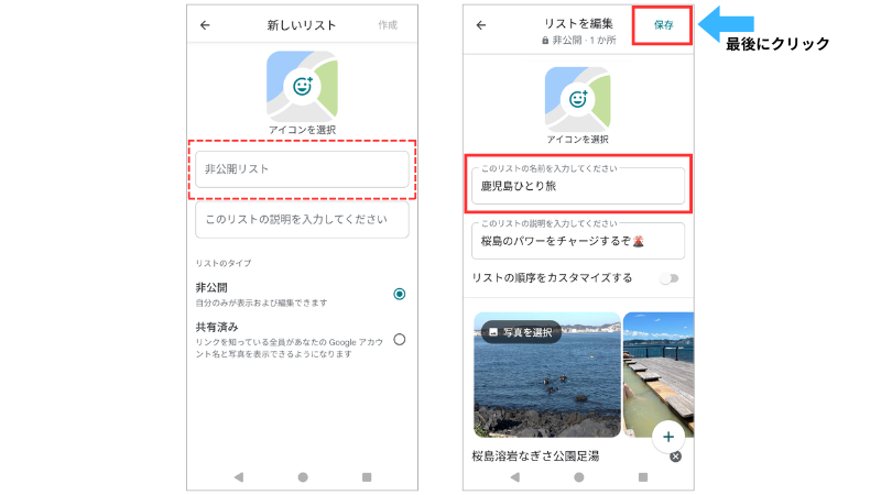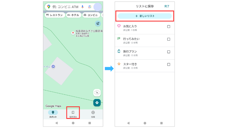 Googleマップを開き、画面下の「保存」→「+新しいリスト」を選択します。