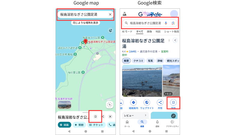 [保存]からリストを開けば、登録した場所一覧や口コミ、営業時間もまとめて確認できます。