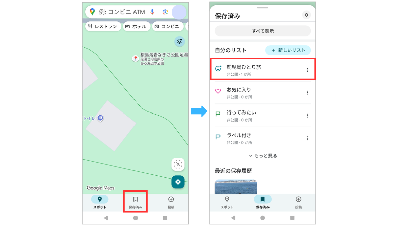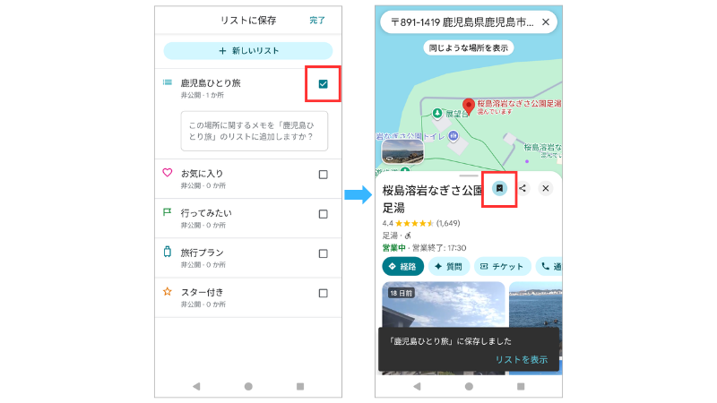 行きたいスポットを検索し、しおりマークの「保存」をタップして作成したリストを選びます。