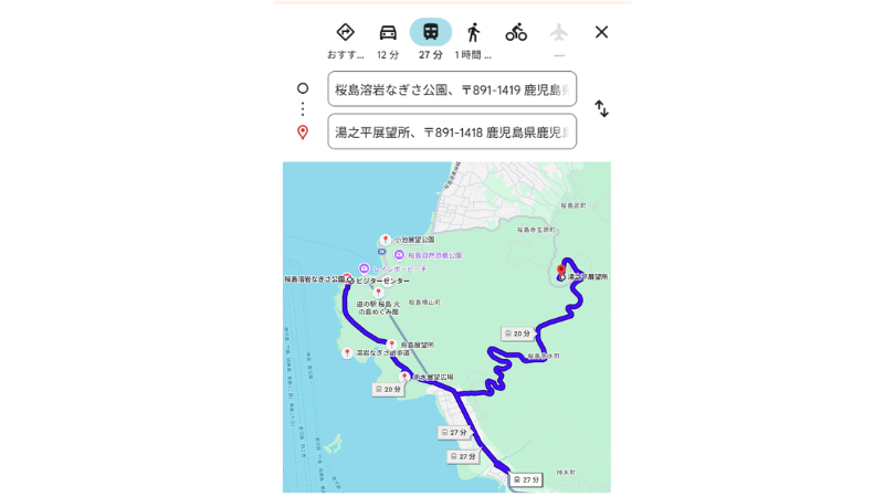 観光地だけでなく、駅やバス停も保存しておくと、スポット間の移動時間も確認できます。